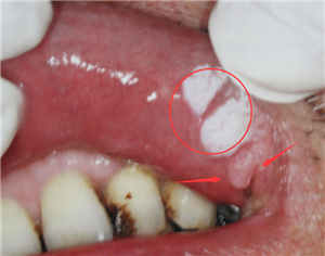 图为:疣状口腔白斑,左侧口角内侧见白色斑块,表面呈疣状突出,见一处乳头瘤样增生物
