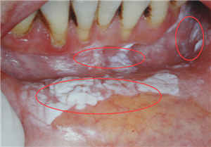 图为:下唇内侧、下前牙牙龈和前庭沟见白色斑块,突出黏膜,表面呈疣状
